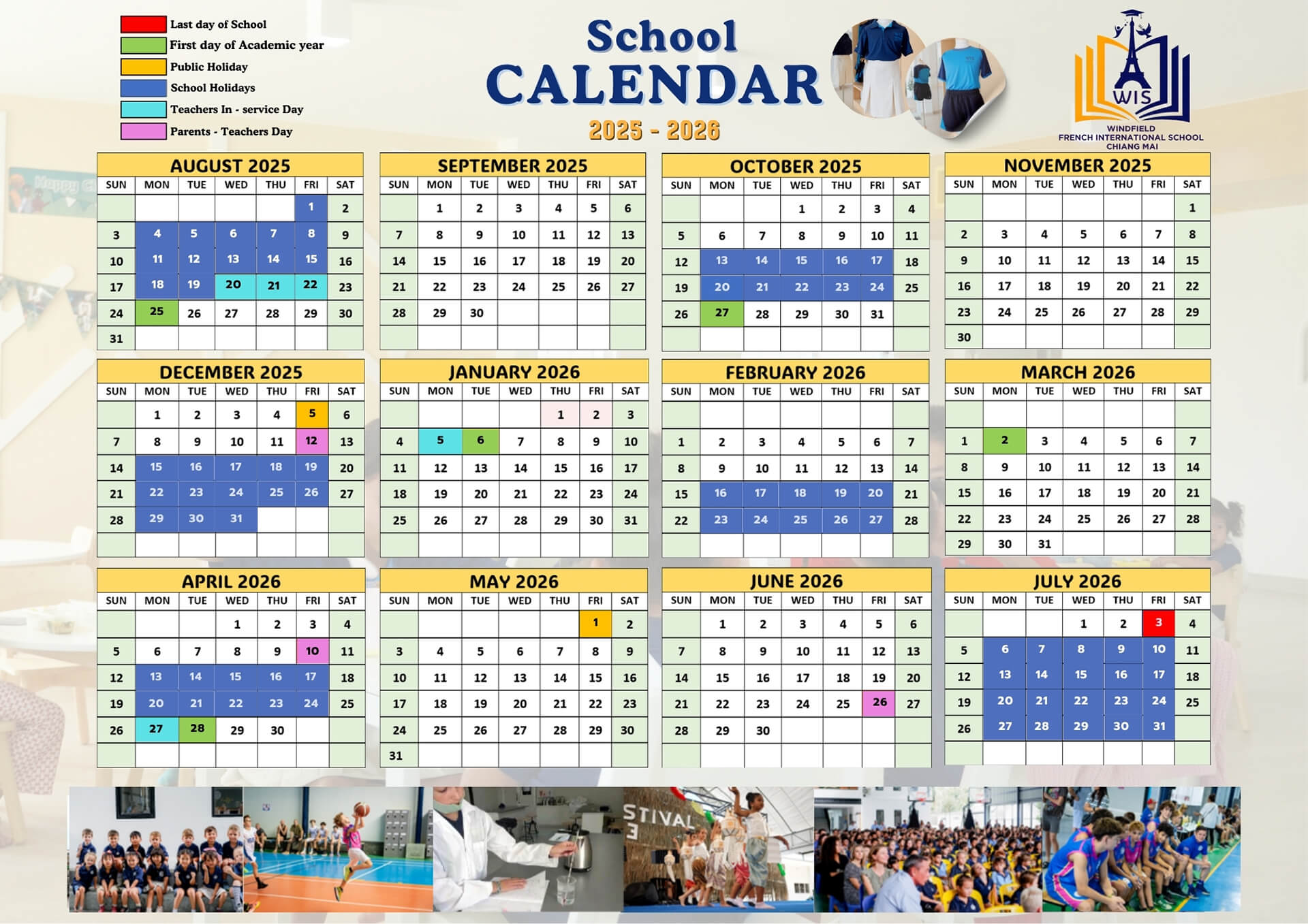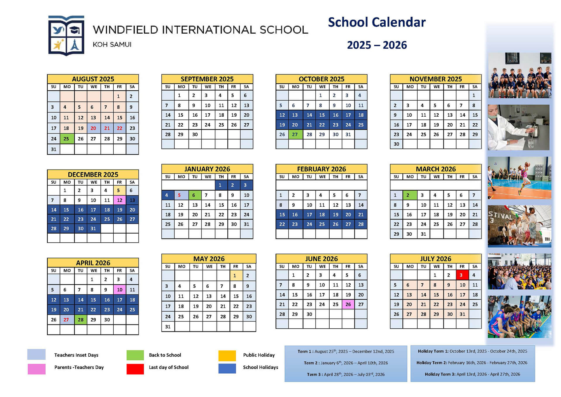 At Windfield International School, we provide clear academic calendars for our campuses in Koh Samui and Chiang Mai. Each calendar outlines important term dates, holidays, and events to help families plan ahead with confidence.